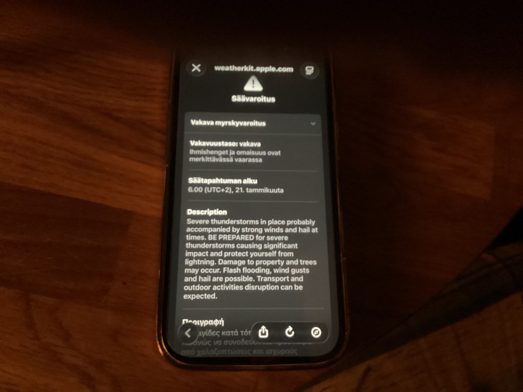 Palattuamme Salliin tuli mun puhelimesta merkillinen ääni. Saimme ensimmäisen kerran varoituksen puhelimeen. Keskiviikkona ei suositella ulkona olemista, kaikki ulkokalusteet vietävä sisään, koulut ja työpaikat ovat kiinni. Autolla ajoa on vältettävä. Vakava sade, tuuli ja ukkosvaroitus annettiin ainenkin tänne Peloponnesoksen alueelle.