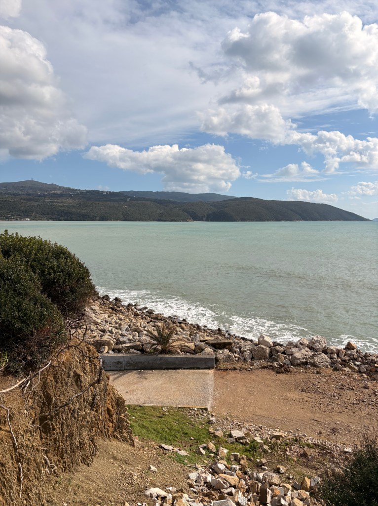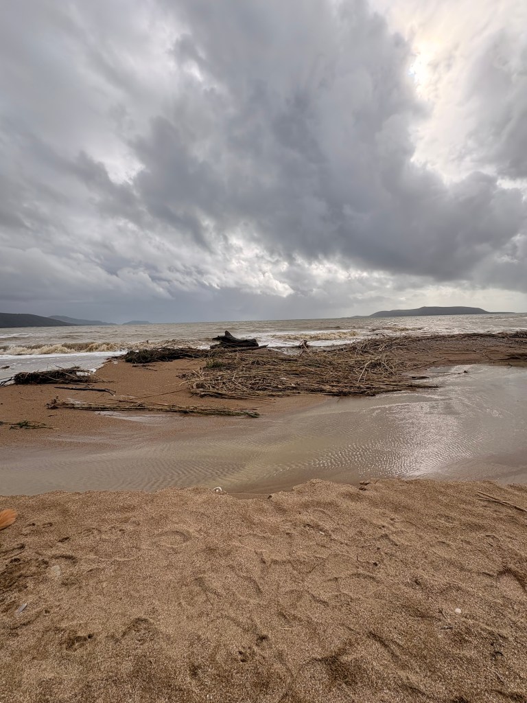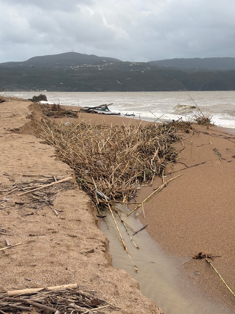 Halusimme mennä katsomaan Methonin leirintäaluetta. Se on aivan meren rannassa ja jännitti miten se on selvinnyt kaikesta sateesta ja tuulesta. No,tiellä piti heittää ympäri sillä aallot olivat heittäneet kivet ja roskat tielle eikä siitä voinut ajaa. Tehtiin sitten takakautta kierto ja toisesta suunnasta tarkastamaan tilanne. Alue oli suljettu eikä ihme. Merestä lentävät kivet olivat rikkoneet ravintolan ikkunoita ja tuoneet roskia myös alueelle.