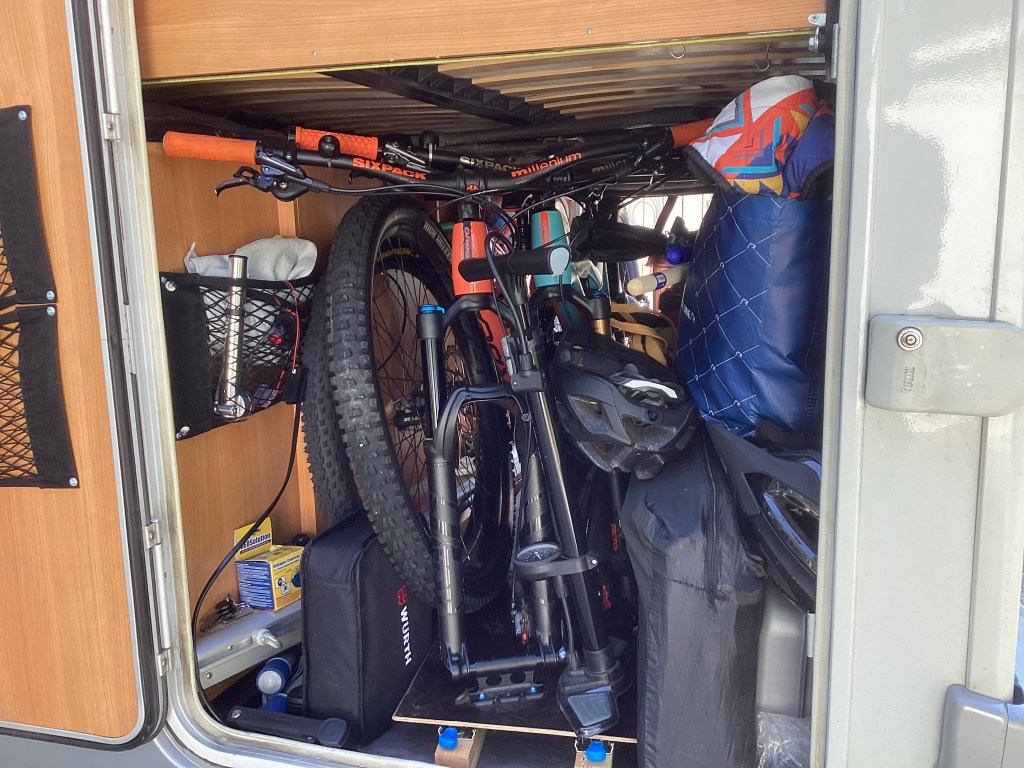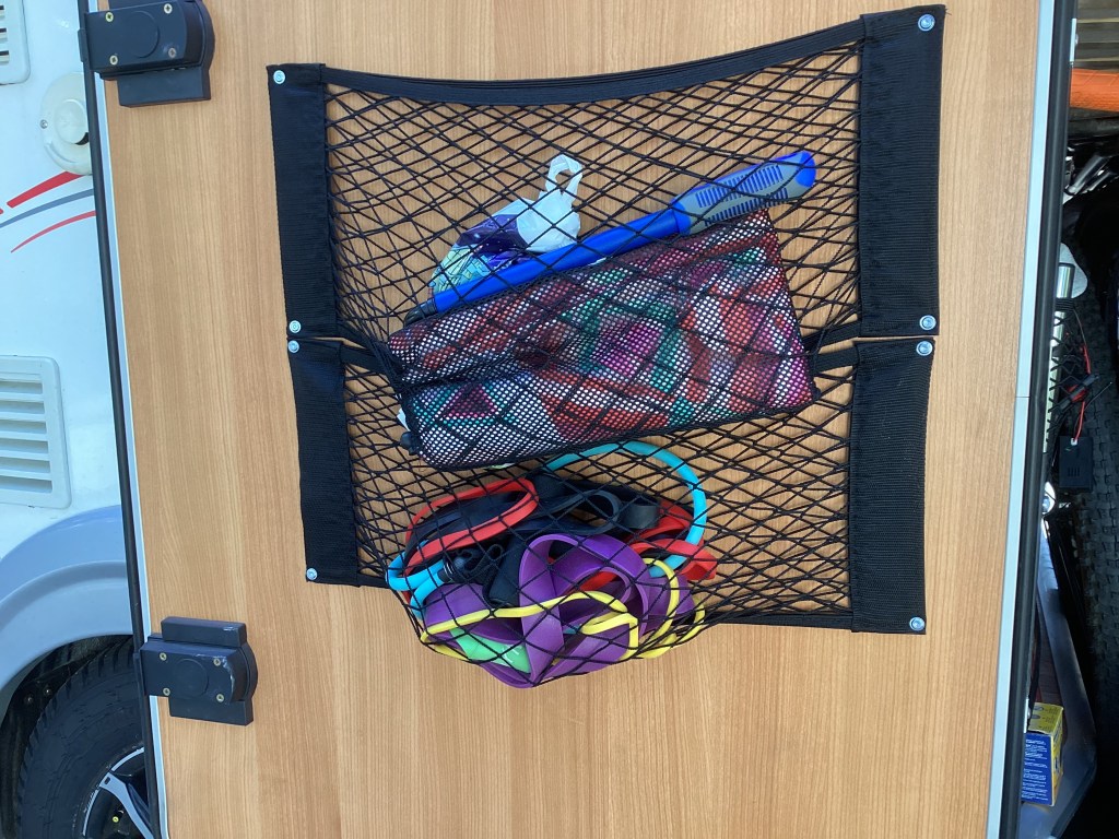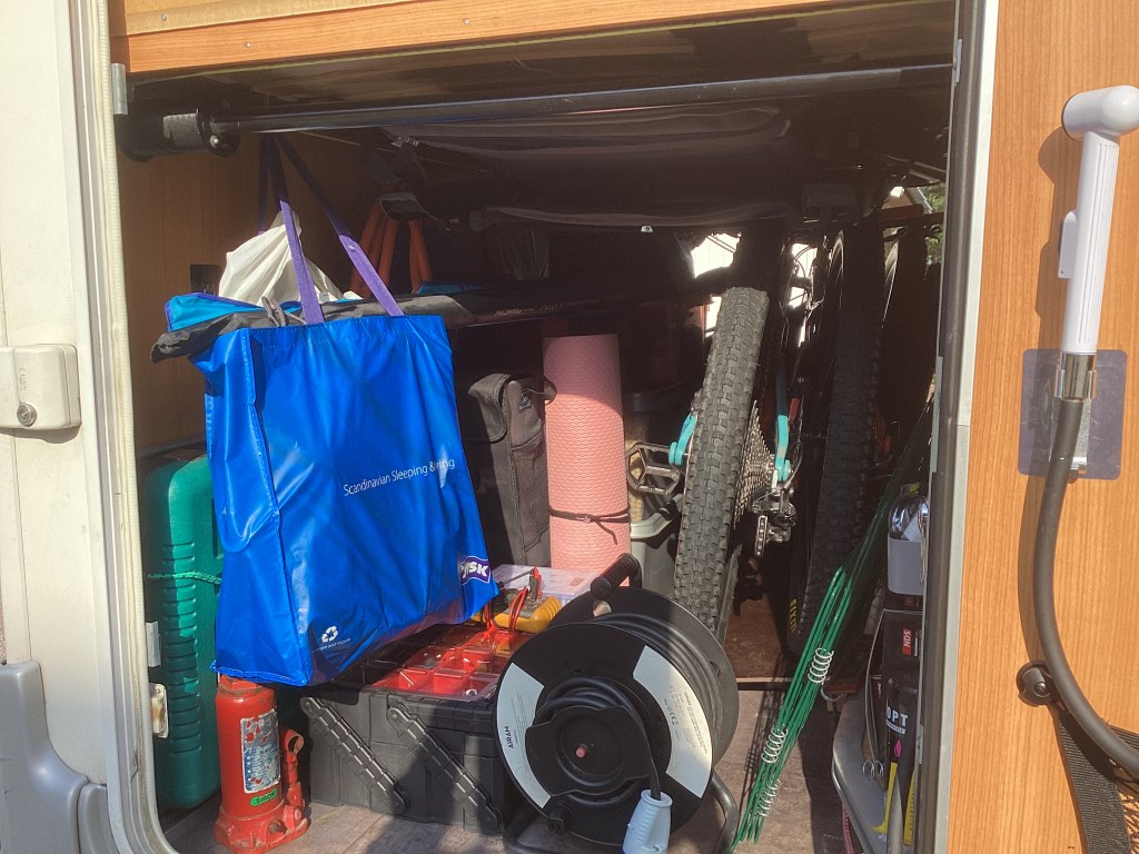 Mukana joogamatto, koirien ruuat, pyörät ja johtoja, työkaluja ja sammutin ,jumppakuminauhoja ,vessapaperia ,talouspaperia ja kempsan kemikaalia jne.