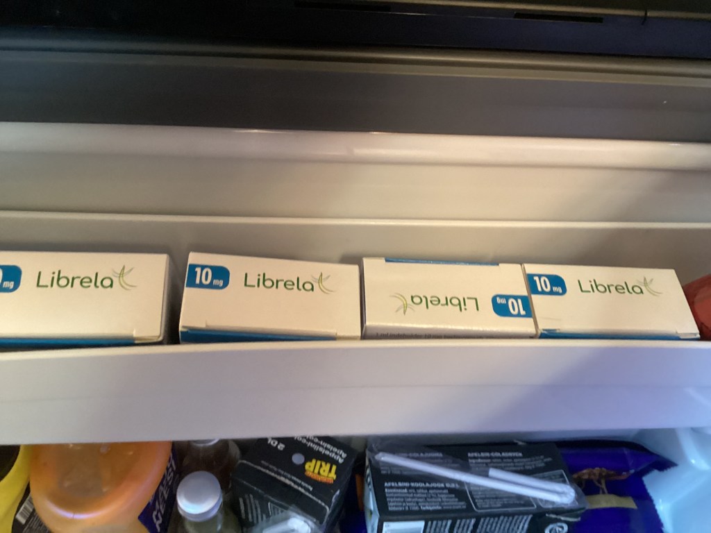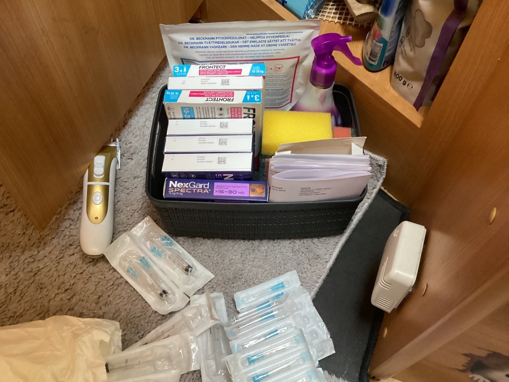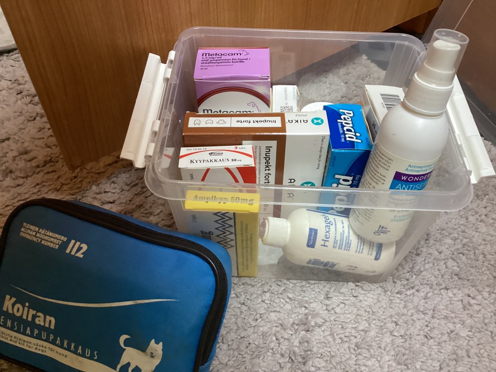 Mukana on punkkipillerit sekä niihin sopiva liuos hietasääskiä varten. Ensiapulaukku, kyytabletit ampiaisen puremaan, desinfiointiliuos, kipulääkkeet, valopannat, Librelaa jääkaapissa ja niihin ruiskut.