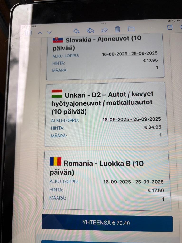 Ostettiin sitten Unkarin rajalla uusi vignette. Sitten tultiin Romaniaan . Vignette ei ollut tullut. Kahdessa kohtaa rajalla olisi sellaisen voinut ostaa mutta ei tajuttu tarpeeksi ajoissa