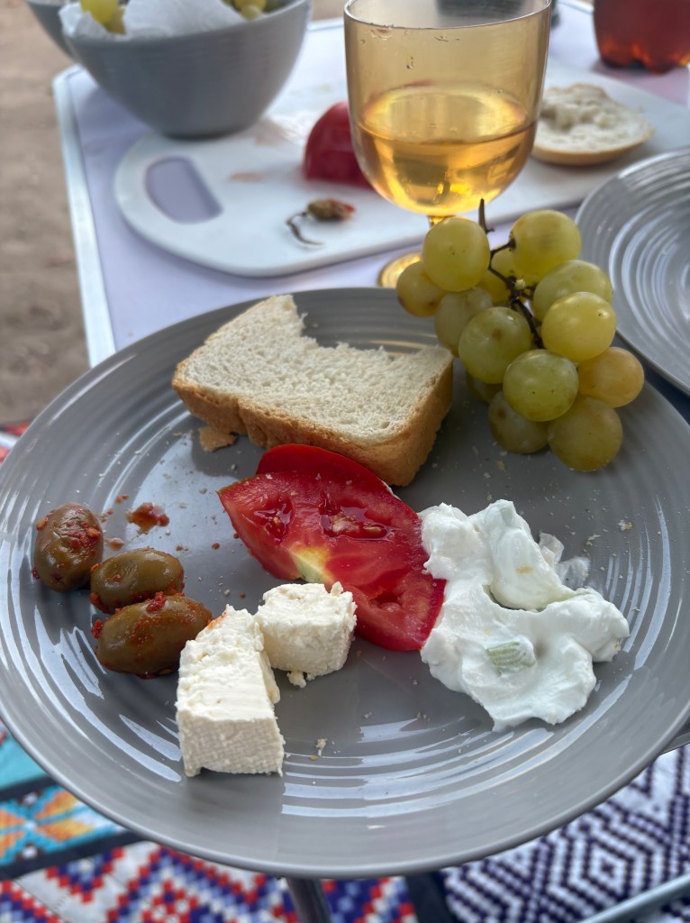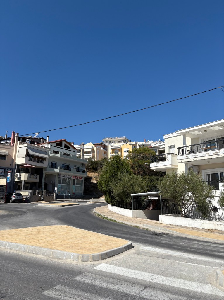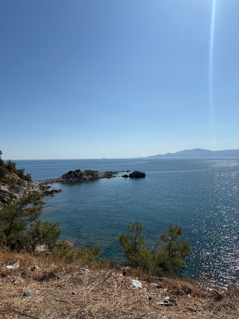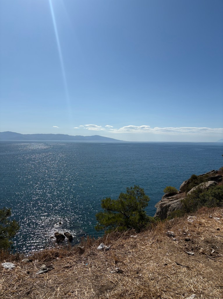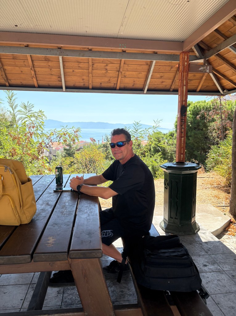 Ensin pysähdyttiin lähimpään kauppaan. Ostettiin tomaatteja ja Ouzoa. Kauppias taikoi meille tiskin alta omatekoista tsatsikia (taivaallista) ja kun sai kuulla,että olemme Suomesta saatiin leipä kaupanpäälle❤️ Kreikkalainen ystävällisyys on ihan muuta kuin Romanian tai Bulgarian.